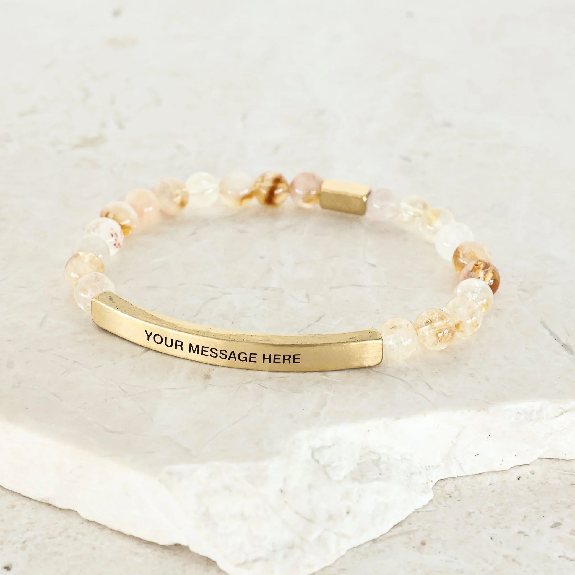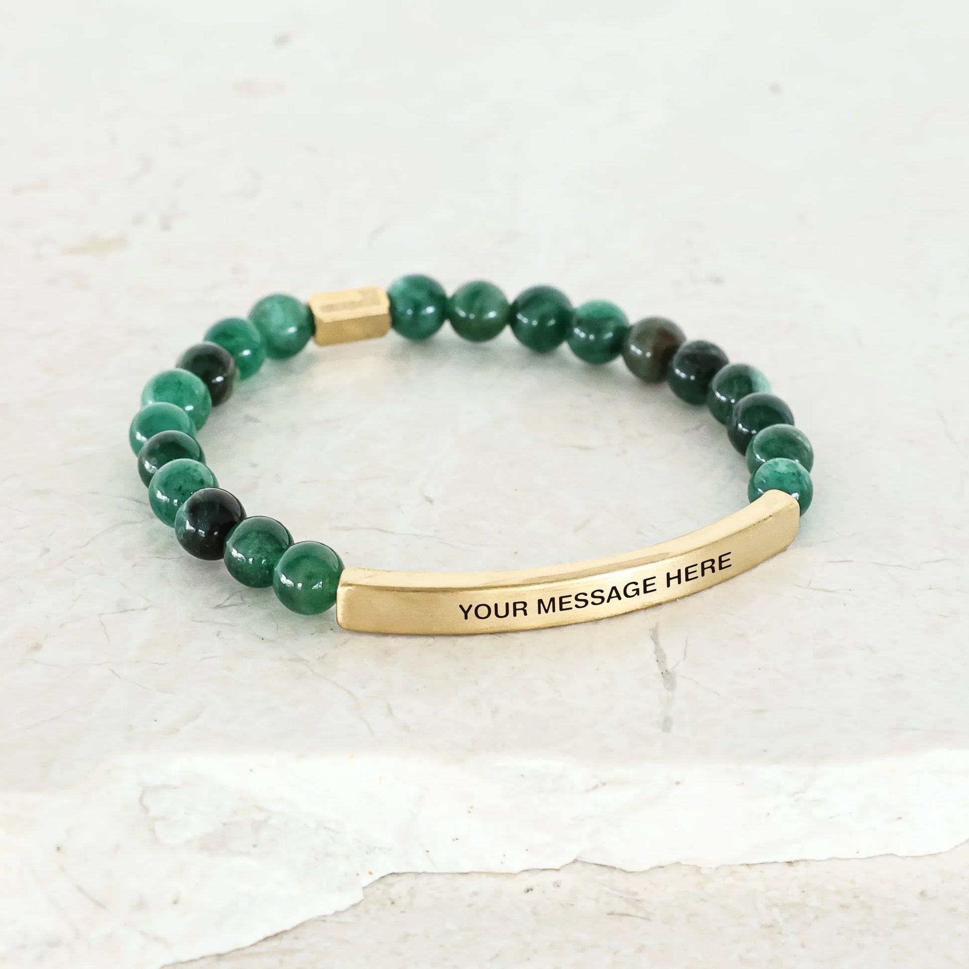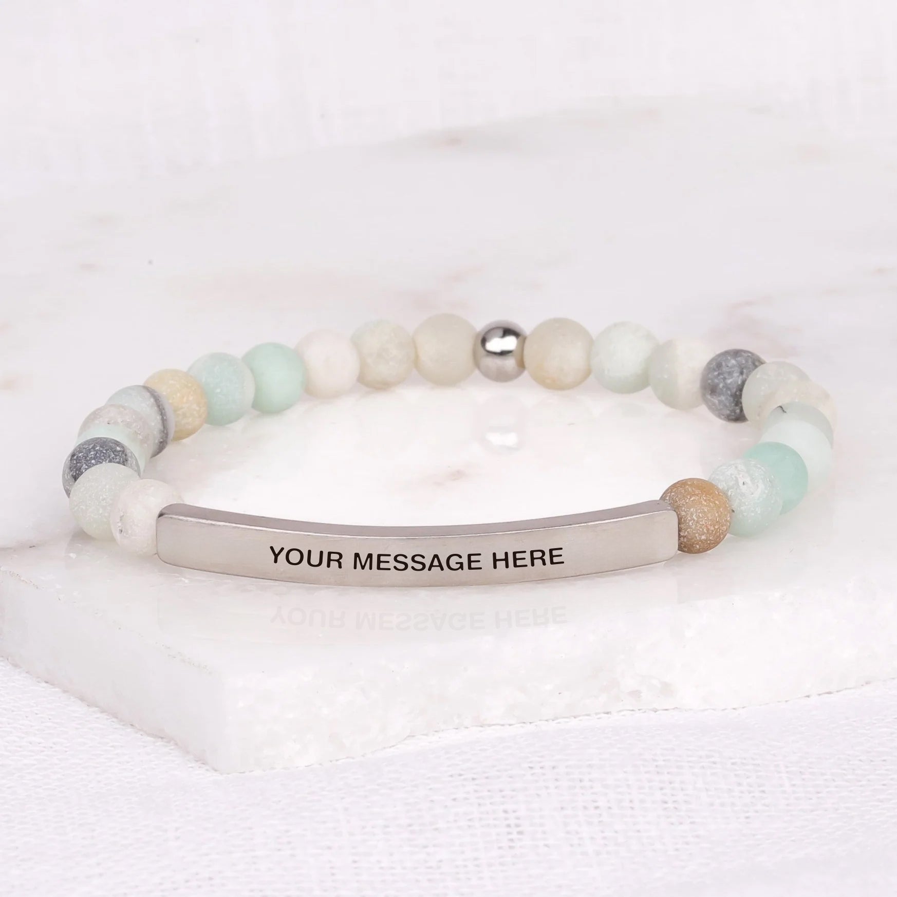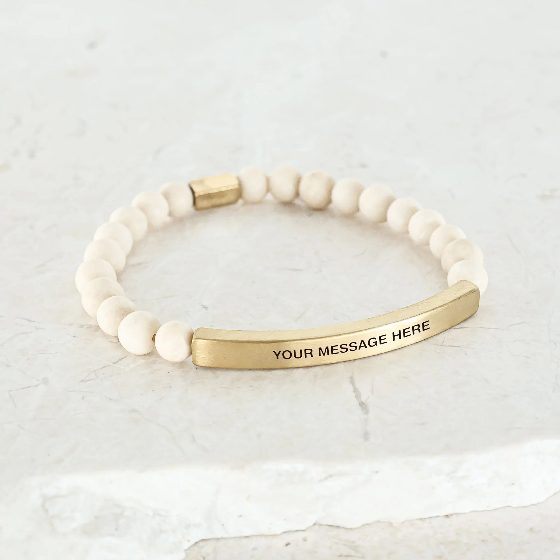 Our inspiration bracelets are beautiful reminders, crafted with 100% all-natural earth stone beads and an engraved stainless steel bar. Wear them throughout the day as a source of inspiration.