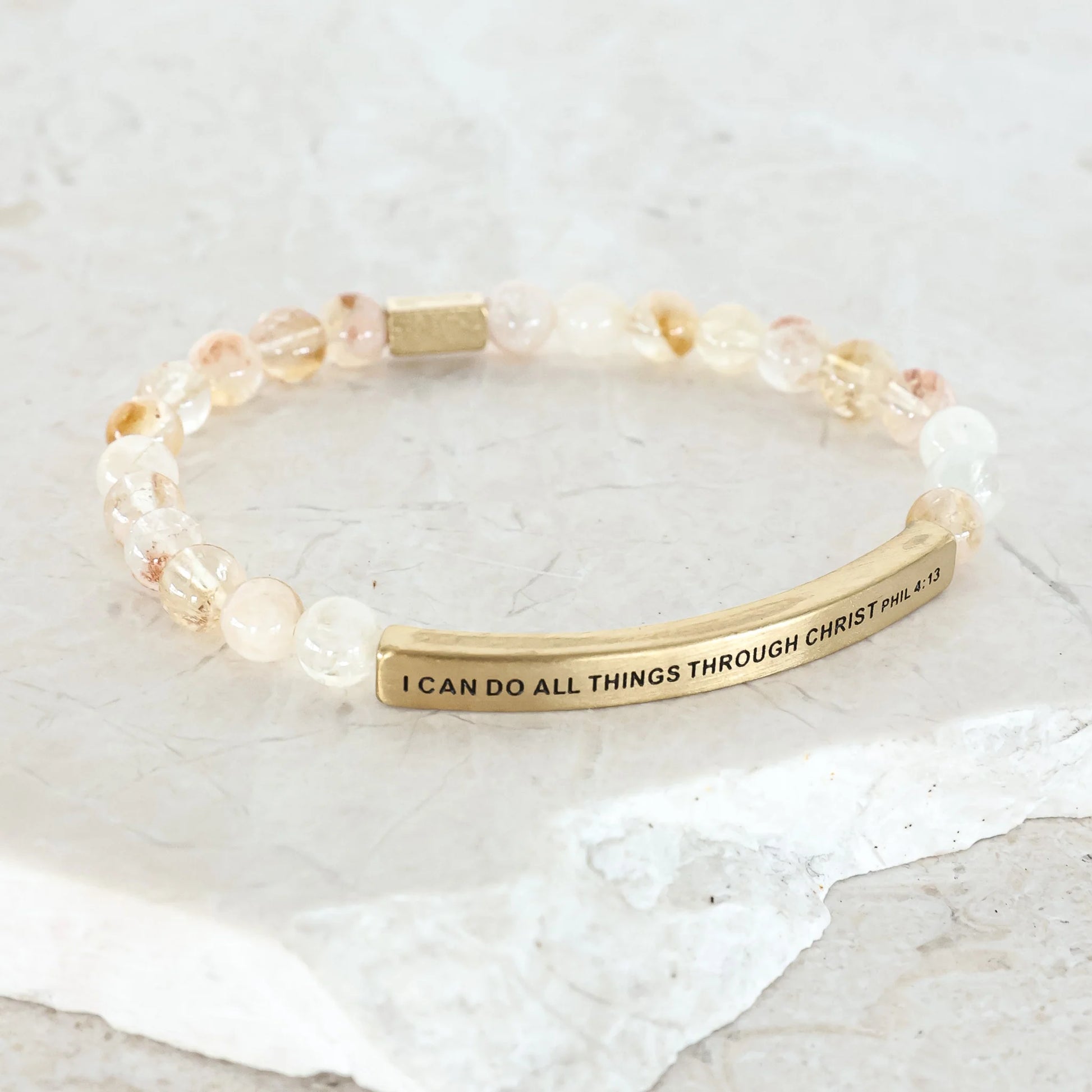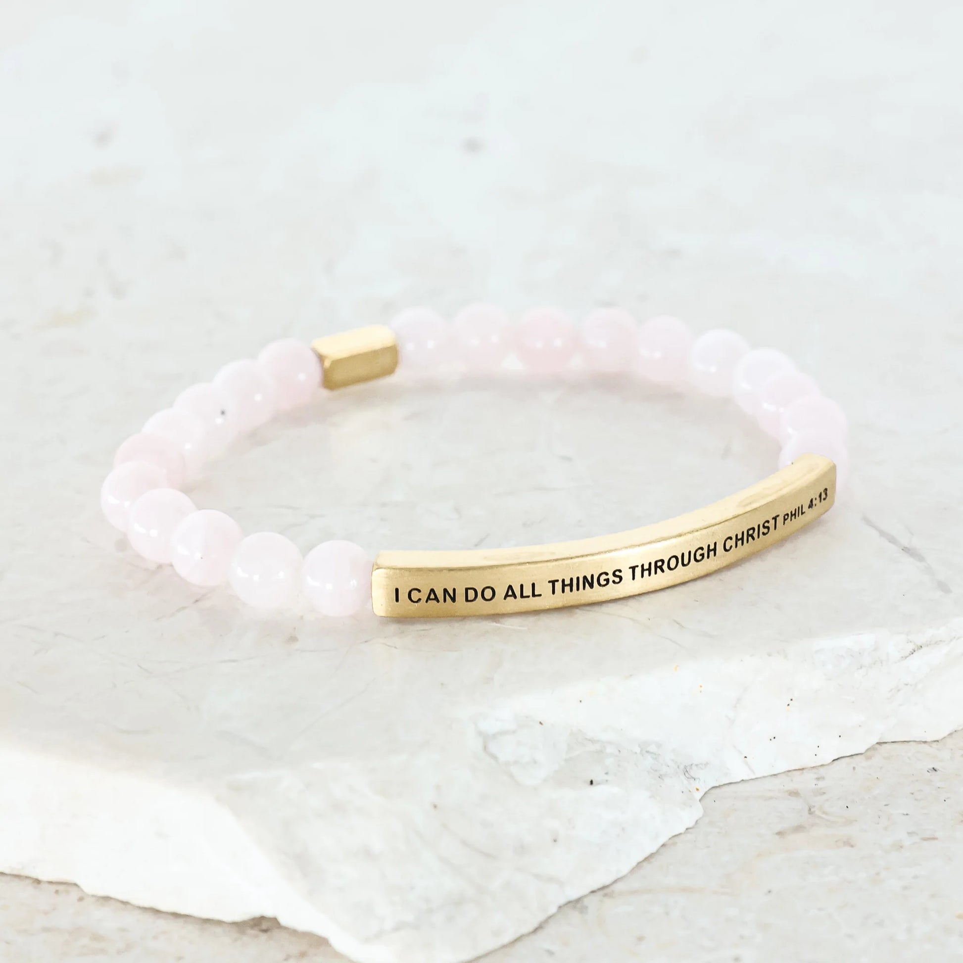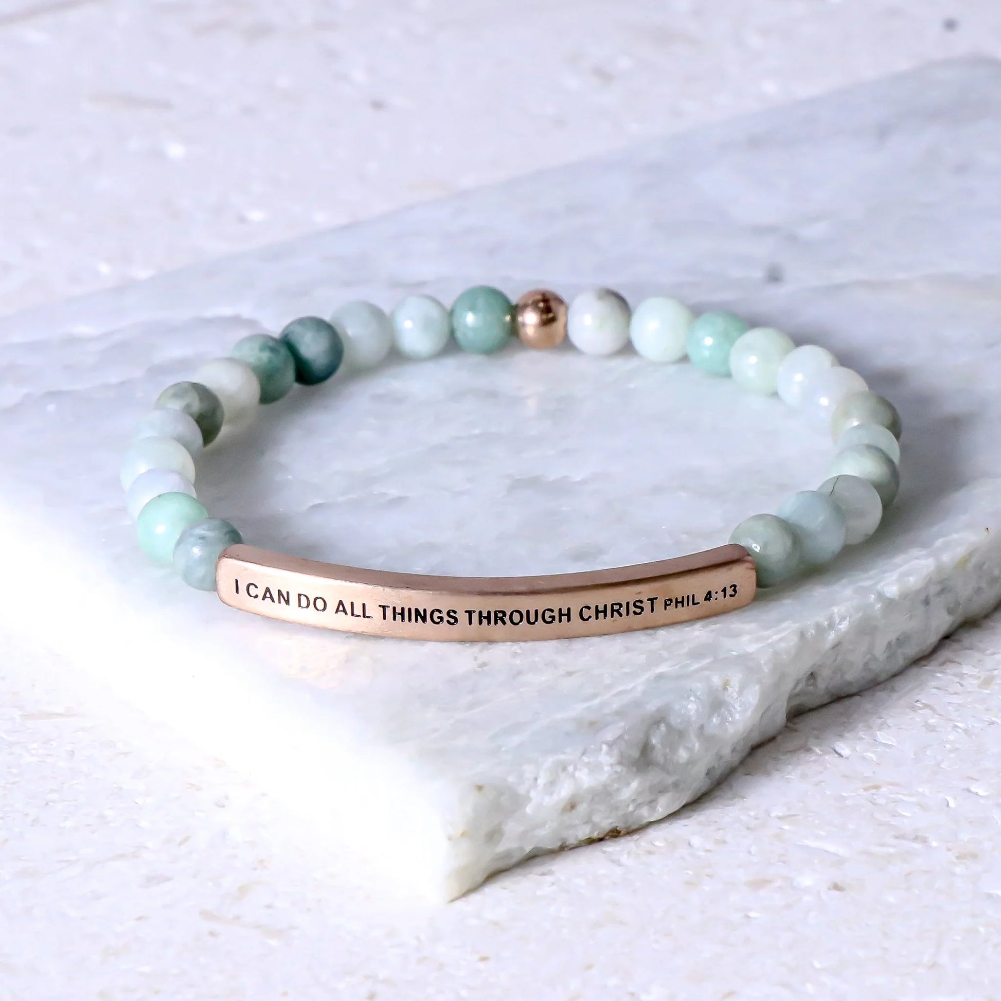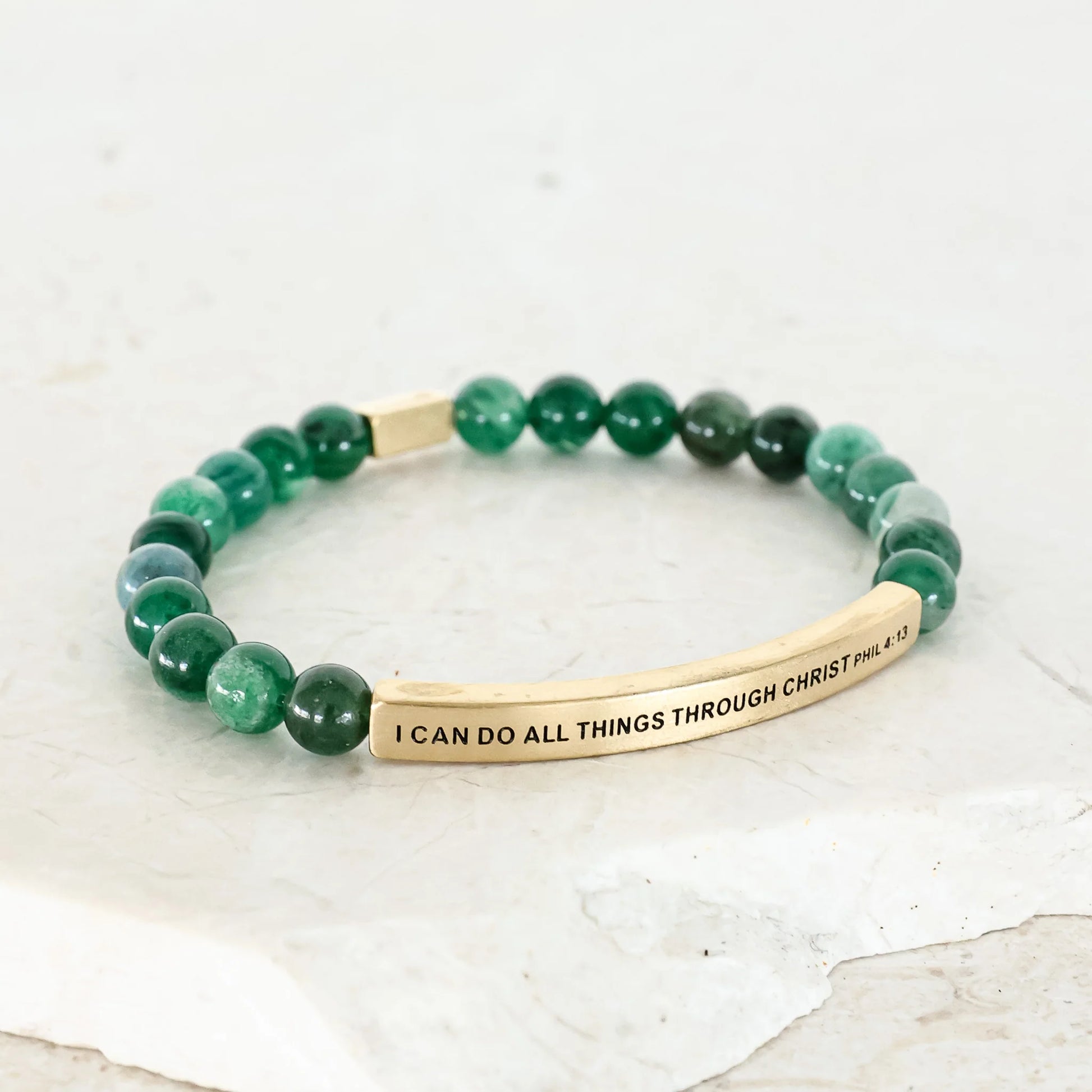 Our inspiration bracelets are beautiful reminders, crafted with 100% all-natural earth stone beads and an engraved stainless steel bar. Wear them throughout the day as a source of inspiration.