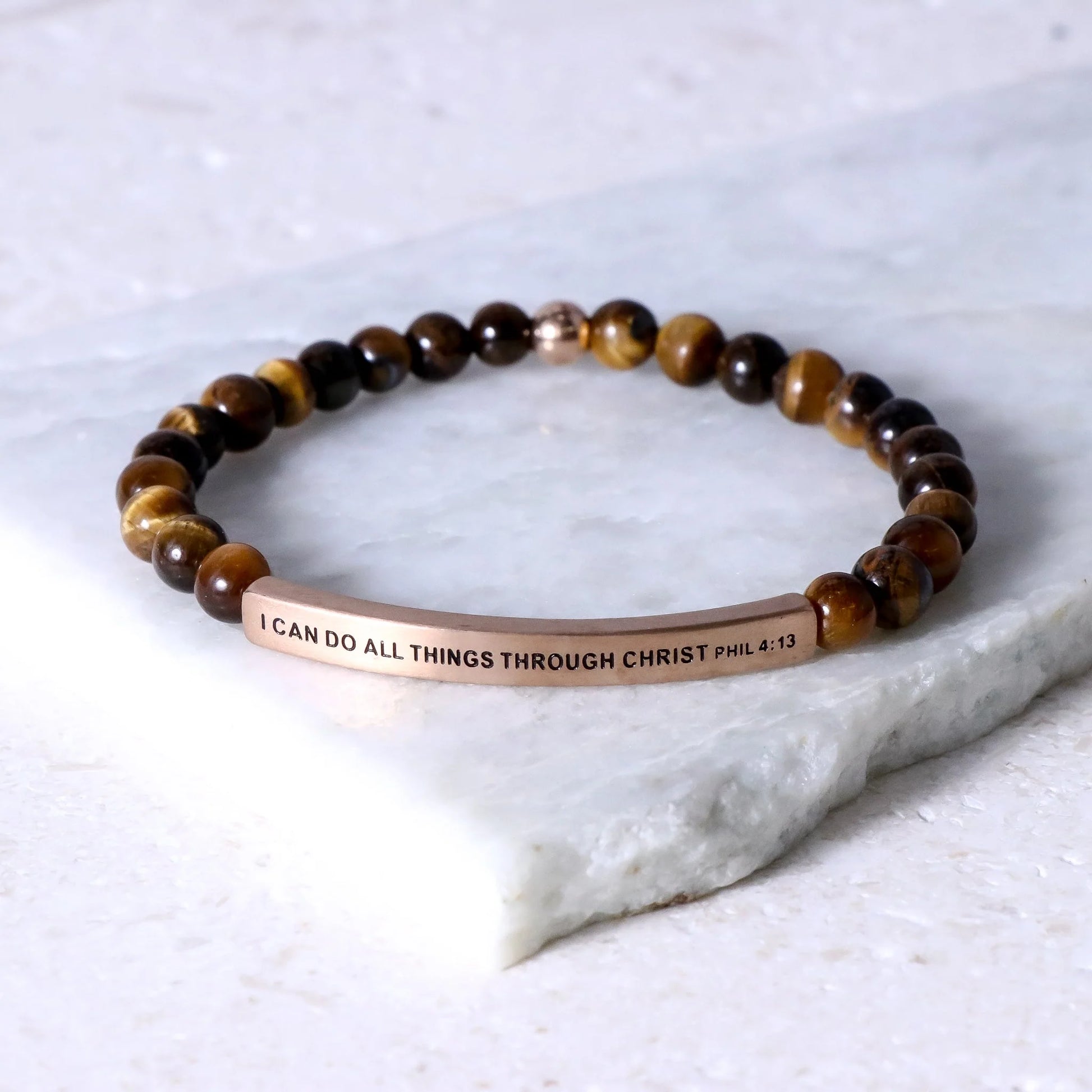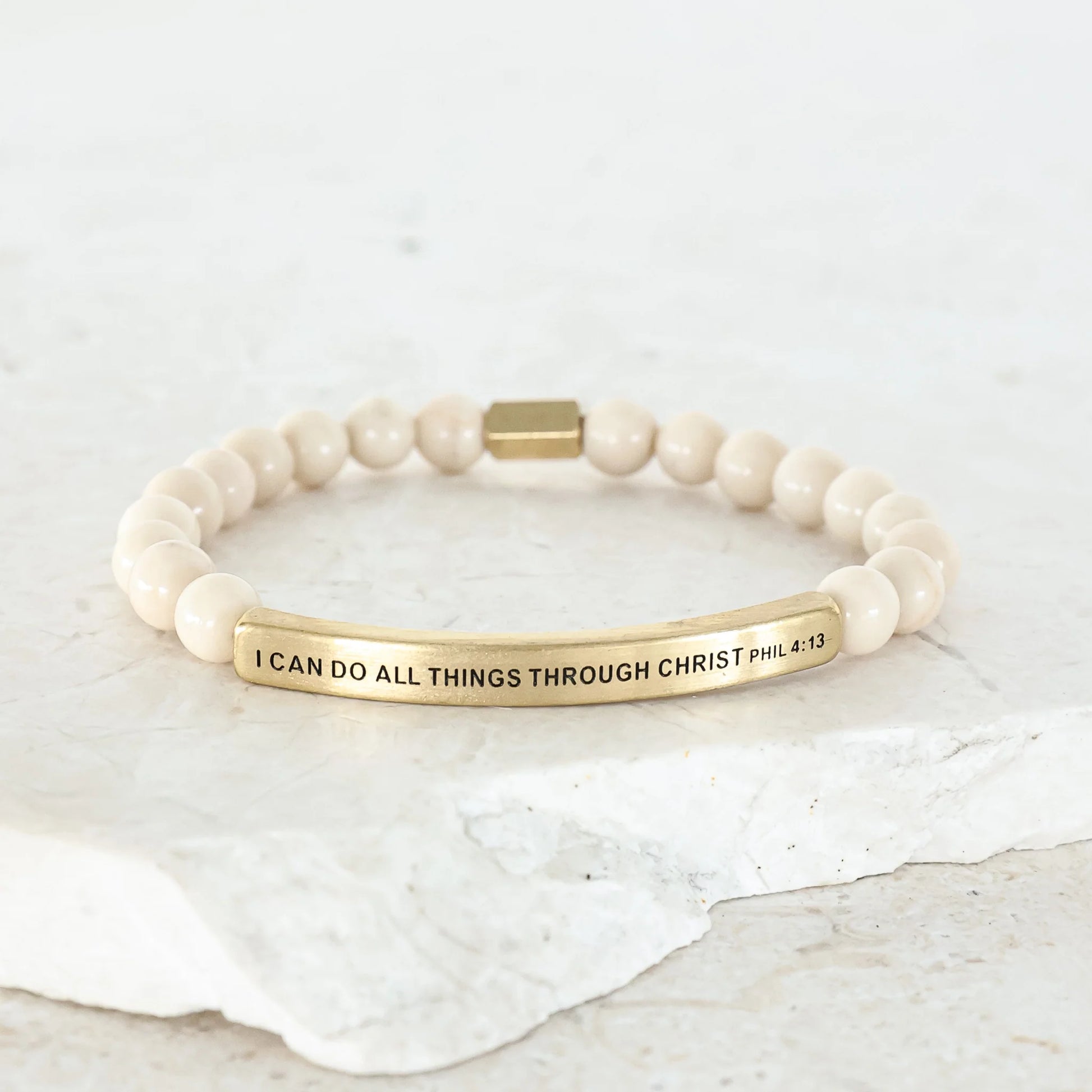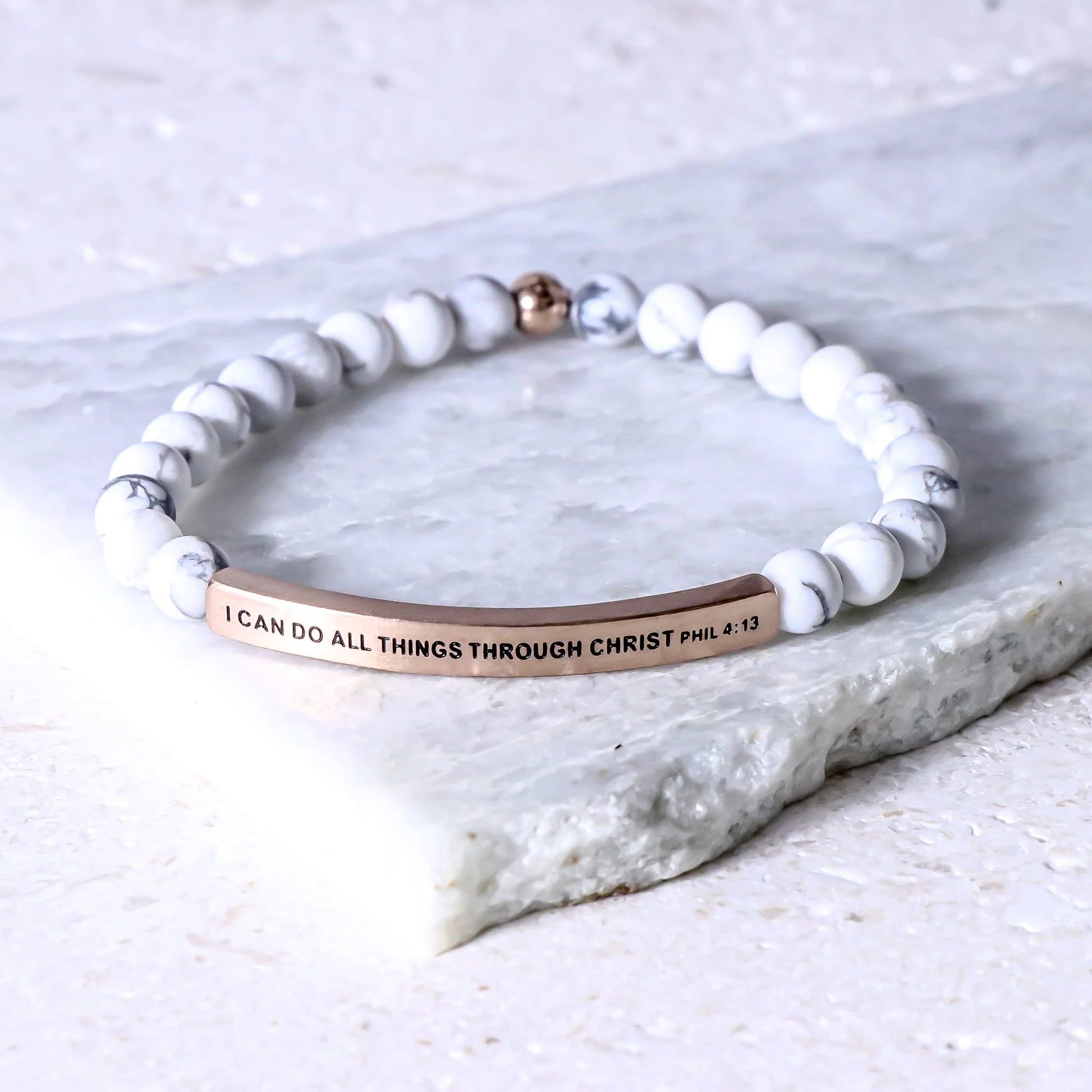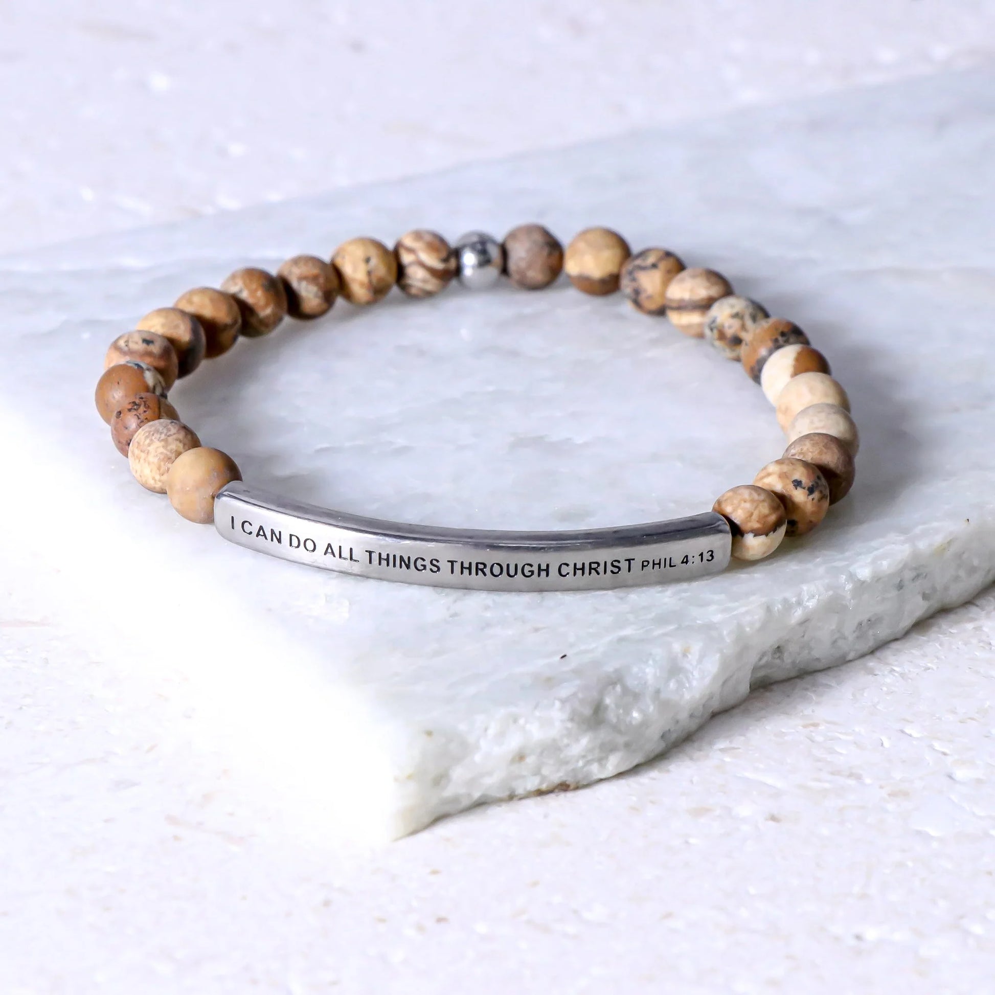 Our inspiration bracelets are beautiful reminders, crafted with 100% all-natural earth stone beads and an engraved stainless steel bar. Wear them throughout the day as a source of inspiration.