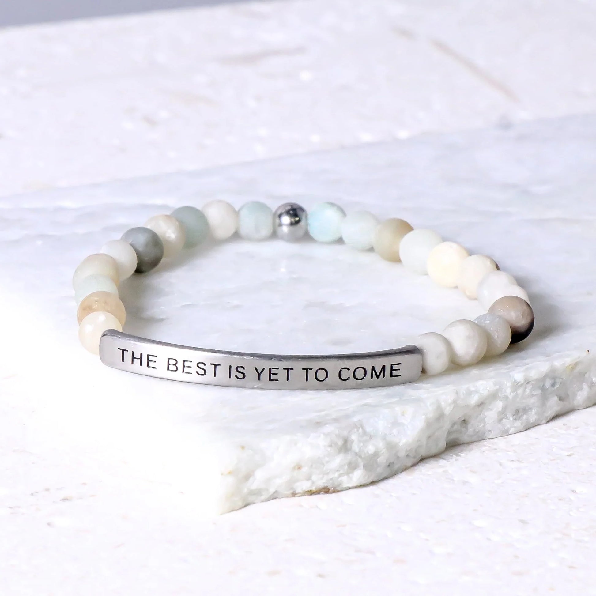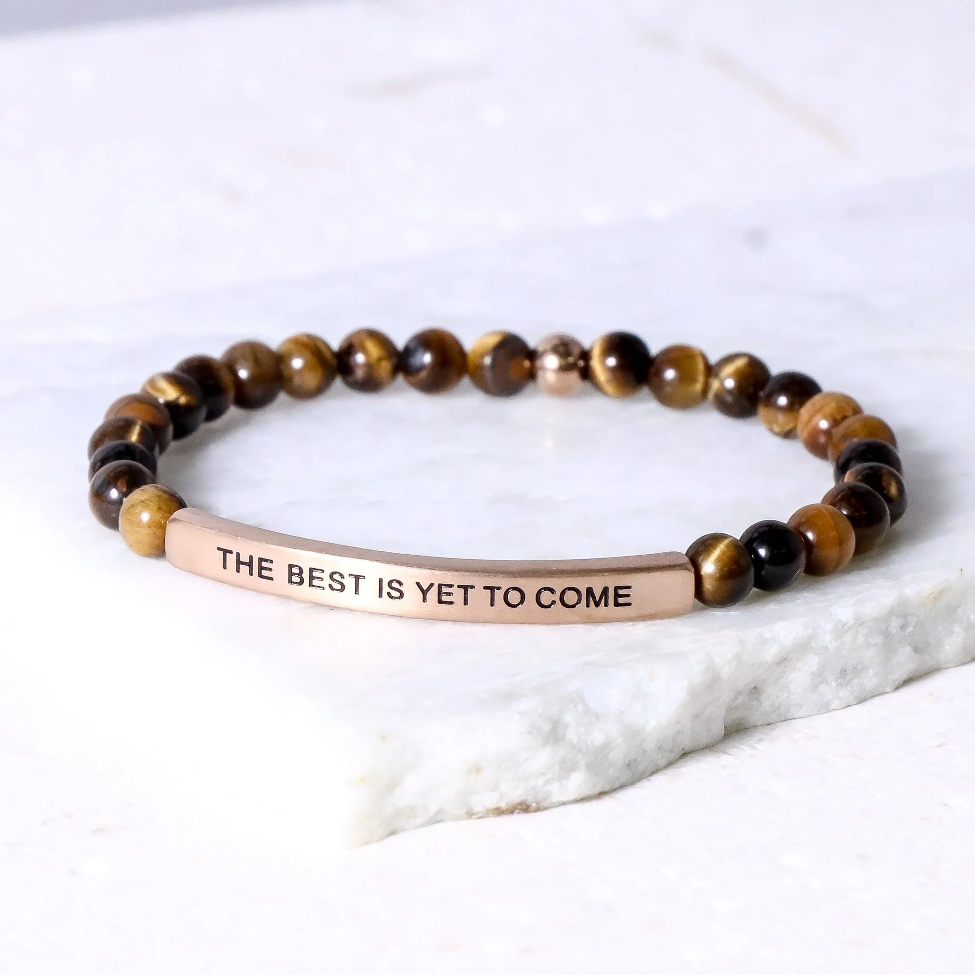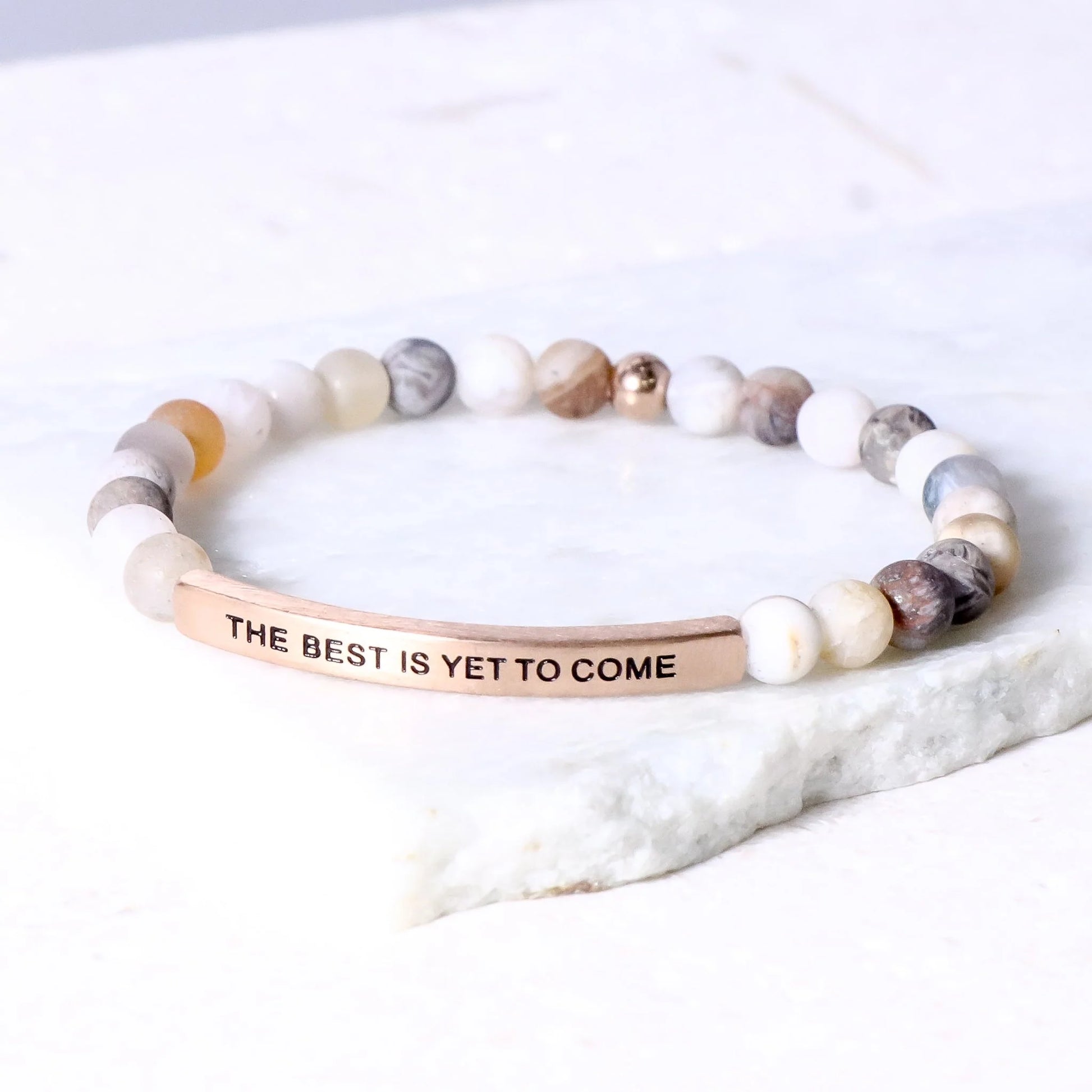Our inspiration bracelets are beautiful reminders, crafted with 100% all-natural earth stone beads and an engraved stainless steel bar. Wear them throughout the day as a source of inspiration.