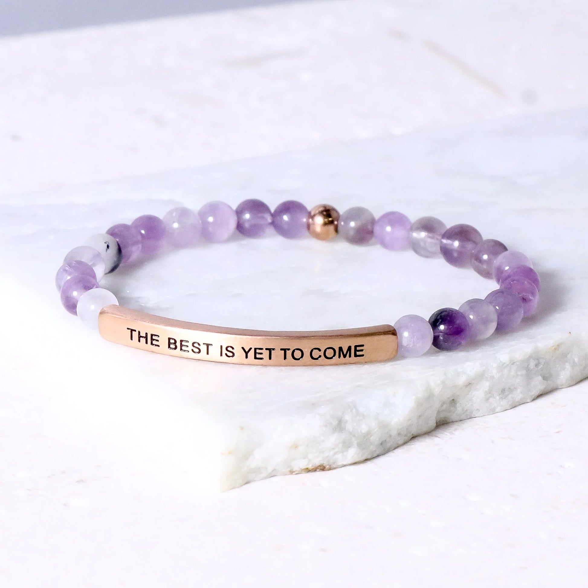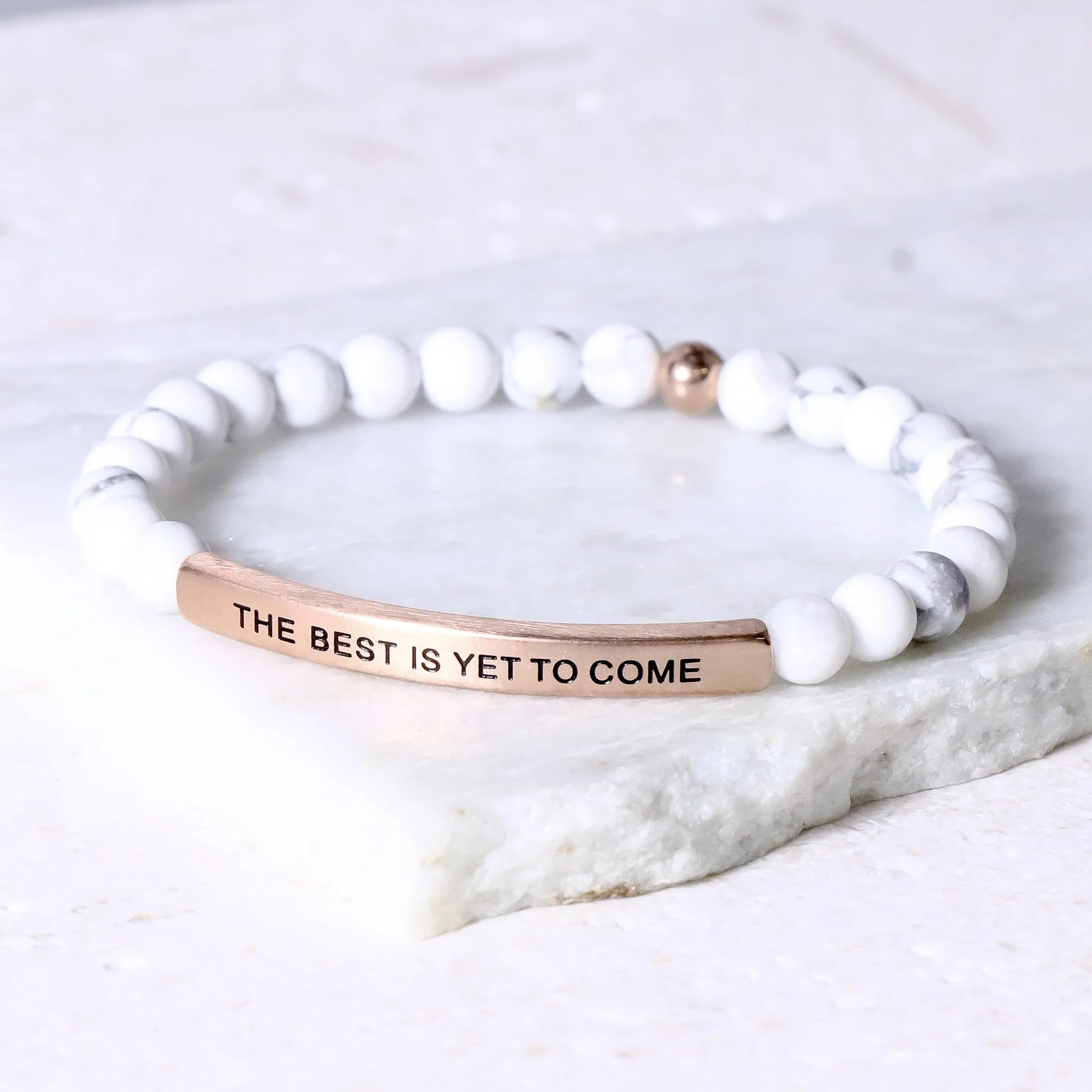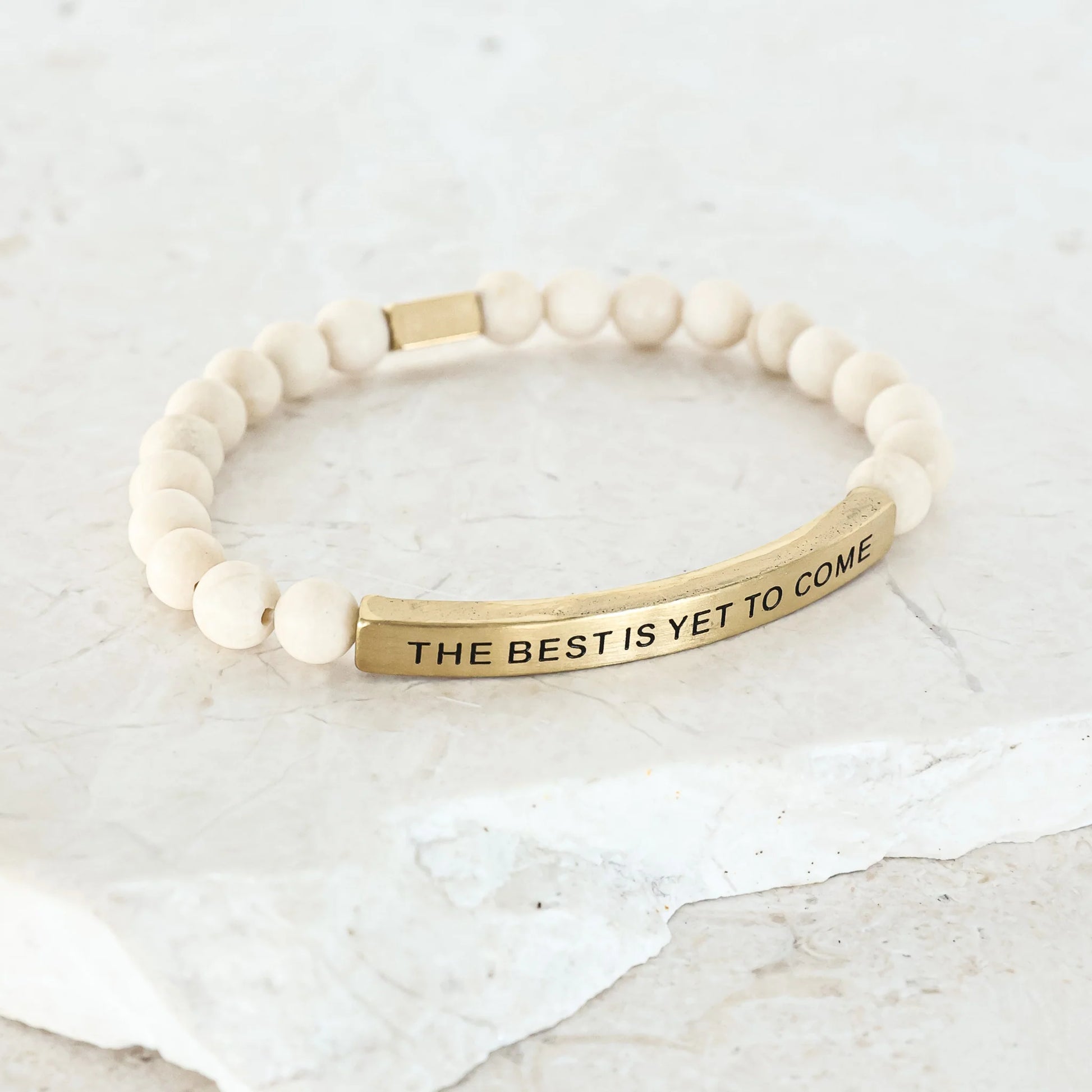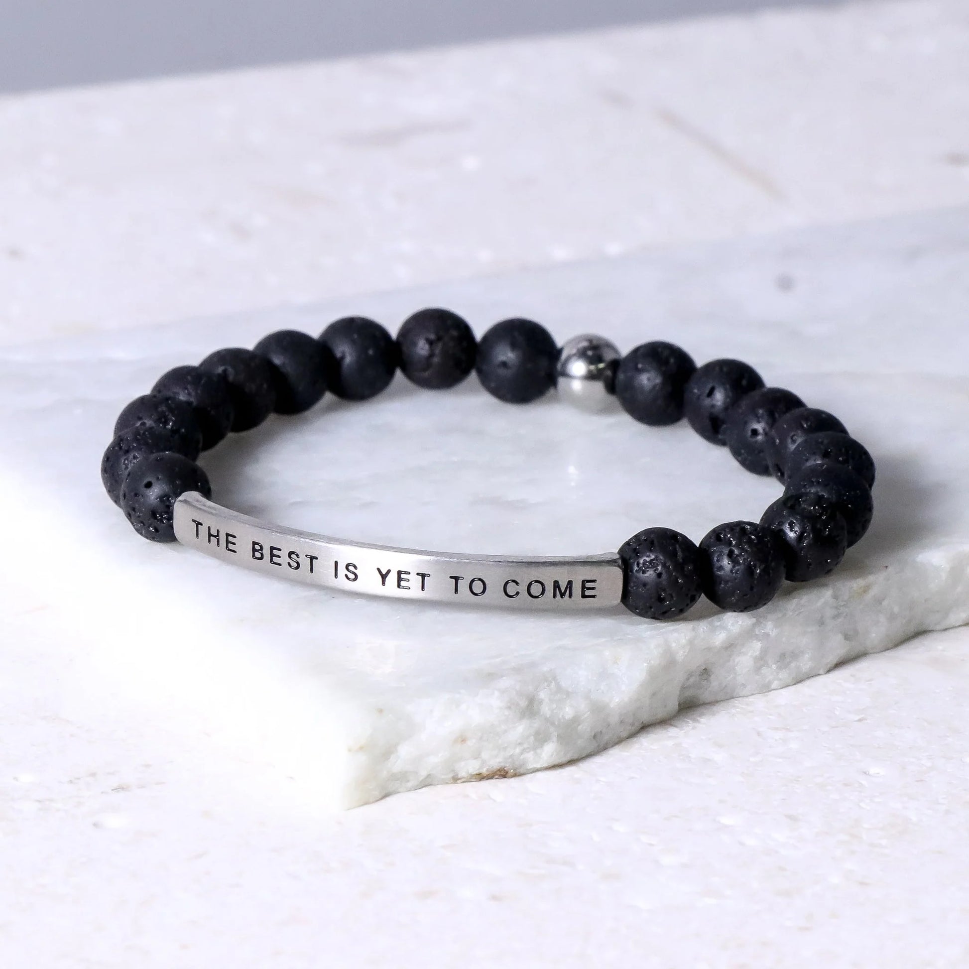 Our inspiration bracelets are beautiful reminders, crafted with 100% all-natural earth stone beads and an engraved stainless steel bar. Wear them throughout the day as a source of inspiration.